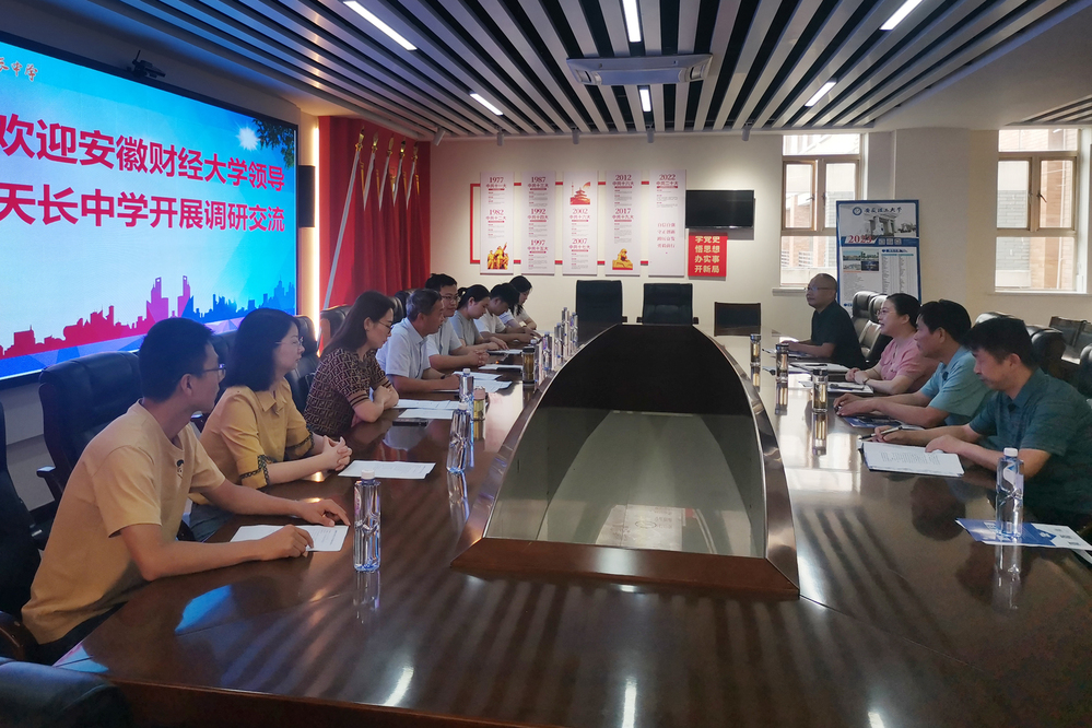 16日上午,九支部前往天长中学开展师德师风建设及招生宣传专题调研。天长中学党委副书记、校长张兆红携相关校领导详细介绍了学校办学历史、办学规模、办学成果和师德师风建设成效。安徽财经大学党委统战部部长、机关党委第九支部书记孙涛在介绍学校办学历程、办学特色和最新发展趋势后,针对性报告了我校近三年天长中学生源学生招生分析、在校表现和毕业后发展情况。他对天长中学连续为我校输送优质生源表示感谢,并就进一步加强后续招生宣传和师德师风建设与天长中学各位领导交流意见。安徽财经大学发展规划处处长、学科建设办公室主任张士杰提出,两校在大中小学思政课一体化建设、心理健康结对帮扶、招生宣传精细化服务等方面有着广阔的合作空间。双方代表就两校合作做了进一步交流。